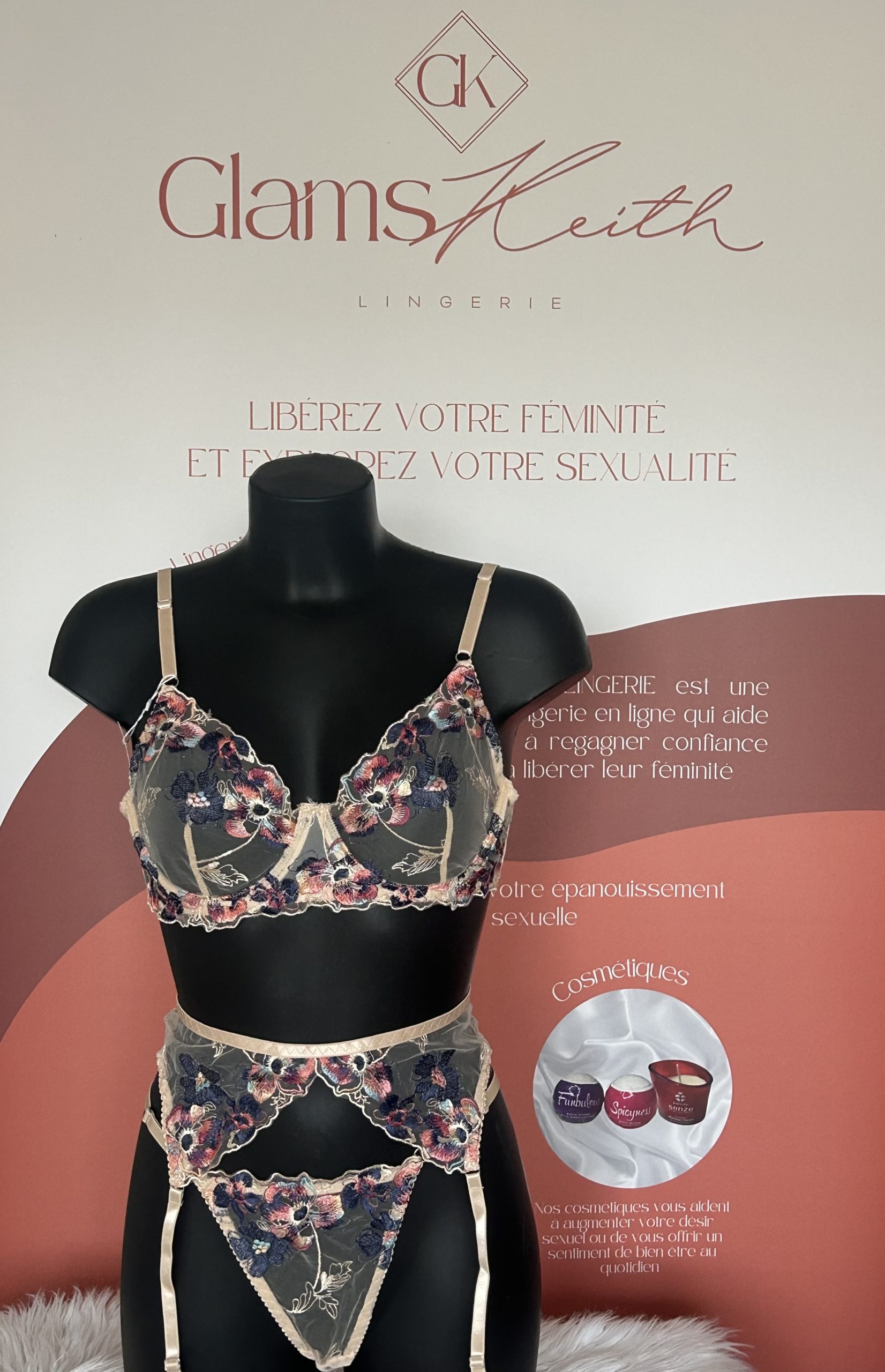 Ensemble lingerie 3 pièces : soutien gorges, string, porte-jarretelles