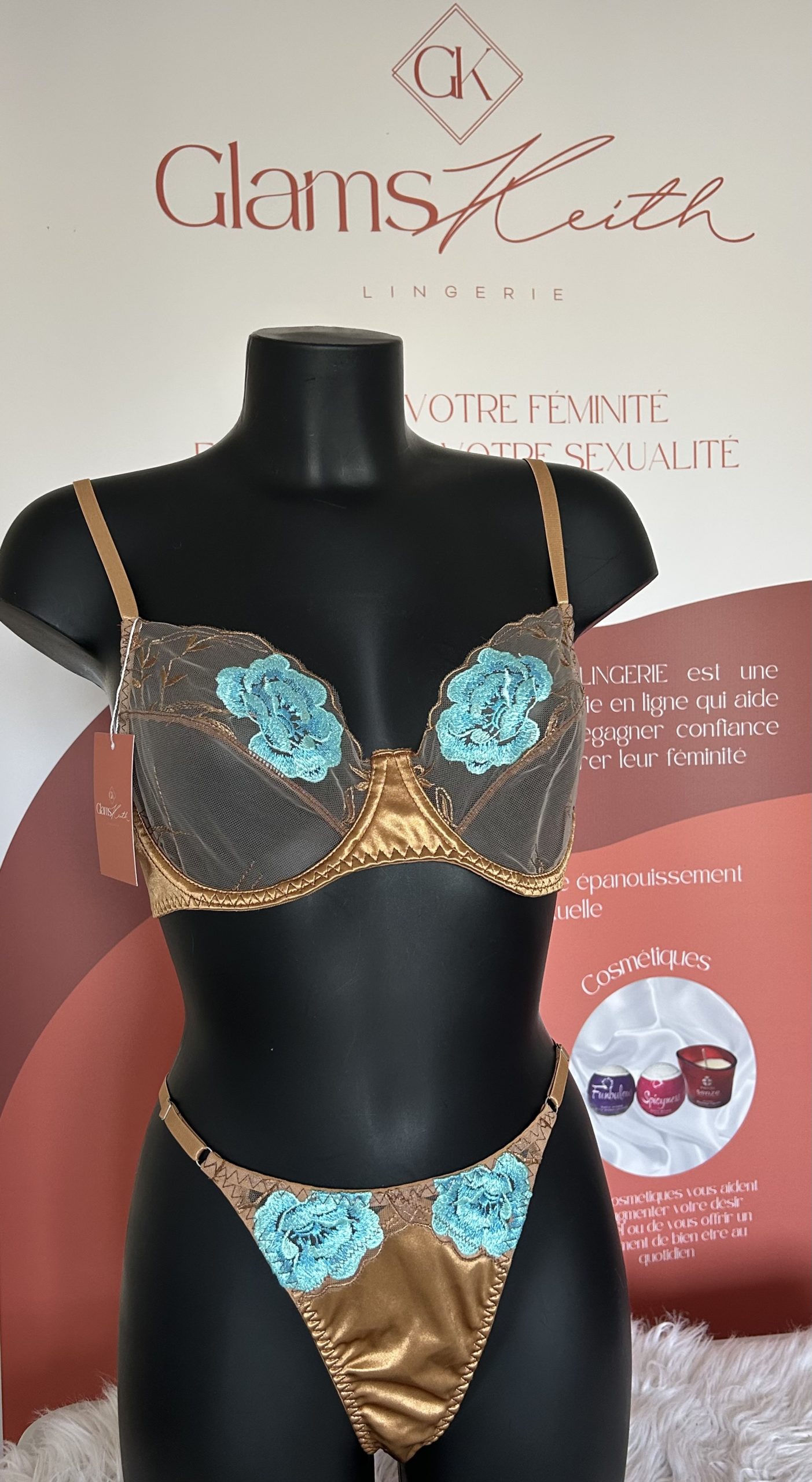 Laissez-vous séduire par cet ensemble lingerie 2 pièces qui marie avec finesse l’éclat du doré et la douceur du bleu ciel. Confectionné en dentelle délicate, il se distingue par ses broderies florales bleues, travaillées avec précision pour sublimer chaque détail.