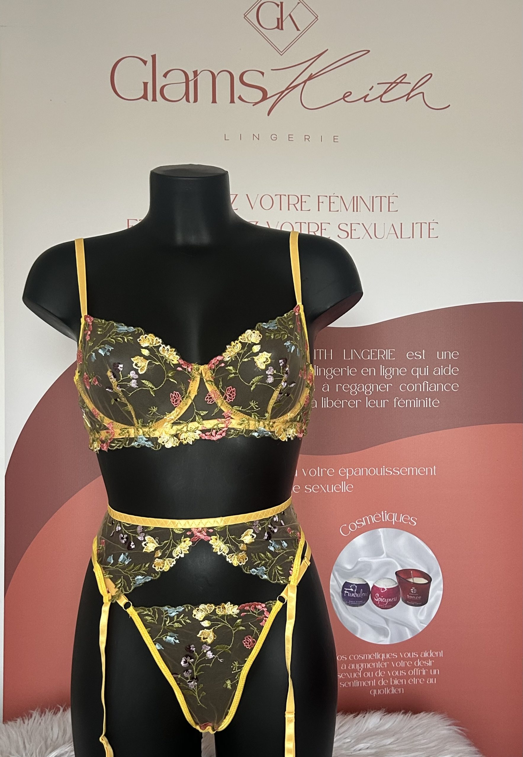 Apportez de la lumière et de la gaieté à votre collection de lingerie avec l’ensemble “Soleil d’Été”, composé de soutien-gorge, culotte et porte-jarretelles. Confectionné en dentelle fine jaune, il est sublimé par de délicates broderies florales vertes, roses et bleues, évoquant un jardin en plein été.